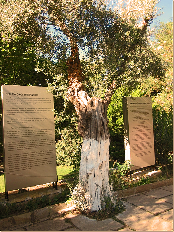 A 600 yr old olive tree. The park attendants paint the lower half of the trunk with lime to discourage insect infestation. |